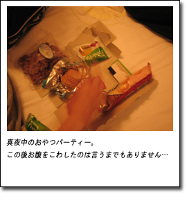 夜12時過ぎ、せいちゃんが予約しておいてくれたホテルに到着。6時間以上のバスの旅にさすがにちょっとお疲れ気味だったけど、部屋の綺麗さに大興奮!!「洗面所もきれい!ギャ−!」とか言ってるのもつかの間、すぐせいちゃんのお母さんに連れられて舟山料理のお店に行きました。初めて食べる舟山料理はかなりおいしくて、深夜にも関わらずお腹いっぱいいただきました☆ その後ホテルに戻ってちょっと休んで、みんなでおやつパーティーをしたよ!どれだけ食べるんだオレら!!結局寝たのは4時位かな?修学旅行みたいで楽しかったさぁ〜♪