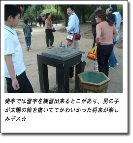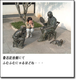 紹興二日目にとつにゅ→朝ごはんは包子と小龍包♪♪朝の空気も澄んでてお腹も大満足で幸せだぁ。蘭亭は紹興のはずれの方にあってホテルからはバスにがたんごとんゆられて40分!!着いたらそこはため息が出るほどキレイな風景が続いていました。右を見ても左を見ても山山山・人間はちっぽけやなぁ。蘭亭には王義之の写し、ならびにその他の著名な書家の作品があるので書道に関心のある老いも若きもみんな大集合でした。彼らの字を見ていると上手すぎて書の中に吸い込まれそう。あんな正確な字が人間から生み出されるなんて信じられませんブラボー。ふむふむと知ったかをして廻っていたら朝バス停で会った人たちにまた会いました。すごい偶然やなぁーと思っていたら彼らは露店に行って、昨日からずっと避けてきたあのブツを私達に突き出してきました。そう、臭豆腐です。随分前に記憶から抹消したはずなのになんで??せっかく買ってきてくれたのに「不要」とは言えず食べるハメになりました、ぐすん。味は・・・普通でした。でも鼻に近づけるだけで大変無理な一品でした。彼らは一緒に船に乗ろうと言い出して乗ることになったんだけど、その船とは簡単ないかだのようなもので今にも沈みそうなくらい物凄く不安げなものなんです。なんでうちらはこんな怖い思いをして見ず知らずの人と船に乗っているのか、全く謎な30分間でした。お昼はまた臭豆腐の店に行こうヨと言われたが人が多くてやめた。内心ほっとした。その後、ピザハットよりも格上のピザ屋さんに入りメニューを開いた。りんごジュースが10元だった。高ッ!!しかも全部おごってもらったし本当申し訳にゃい彼らも上海の人らしくまた遊ぼうなんてな言葉を交わしつつお別れ。結局なんやったんやろ、でもいい人達だった。再見!!その後魯迅記念館や魯迅にゆかりのある場所を色々見て回った。作品は一つしか読んだことがないけどみんなに愛されているトコロからすごい偉大な人だと再確認した。一つ分かったことは中国人は写真を撮るときアイドルショットだとゆーことだ。この二日間めちゃくちゃ疲れたケド色んな意味で成長できた旅だった。中国語はいっぱい聞いたけど話せなかったすぅいこれからの課題も山積みです。でも得がたい経験をいっぱいできた素敵な二日間デシタ最後まで読んでくれて謝謝(^3^)/