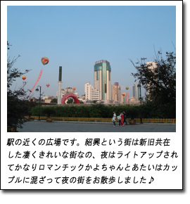 10月4日と5日に大好きなかよたんと紹興に二人旅行に行くことになりました・・・ぐふふ 紹興は春秋時代の越の都でもあり、また魯迅の故郷としても名高いところデス。行きは軟座で三時間!!日本の新幹線に近くてかなり快適でした。横に座ってた女の子がちょこまかしててめちゃんこかわいかった中国の子供はなんであんなにめんこいの??汽車を降りたらそこはもう別世界、紹興は思ったよりも全然都会でした。駅には中国語で「三輪車」と呼ばれる自転車に人力車がついたやつみたいなやつがいっぱい停まっててこっちでゆータクシーだと思ってたら、おじさんに声を掛けられ、これに乗って一人90元で市内観光しないかとゆー。かなり迷ったんだけど一度乗ってみたかったことも手伝ってて今日一日をおじさんに託すことにしました☆☆彼はところどころ方言があって聞き取りづらかったが、凄くいいヒトでした。お腹が減ったとゆったら観光コースにないご飯を食べに連れっててくれたり写真を撮りたいとゆったらスピードをゆるめてくれたりと、まるであたい達はお姫様で馬車に乗ってるかのようでした・・・また妄想癖が それにしても中国人の運転技術にはあっぱれ!